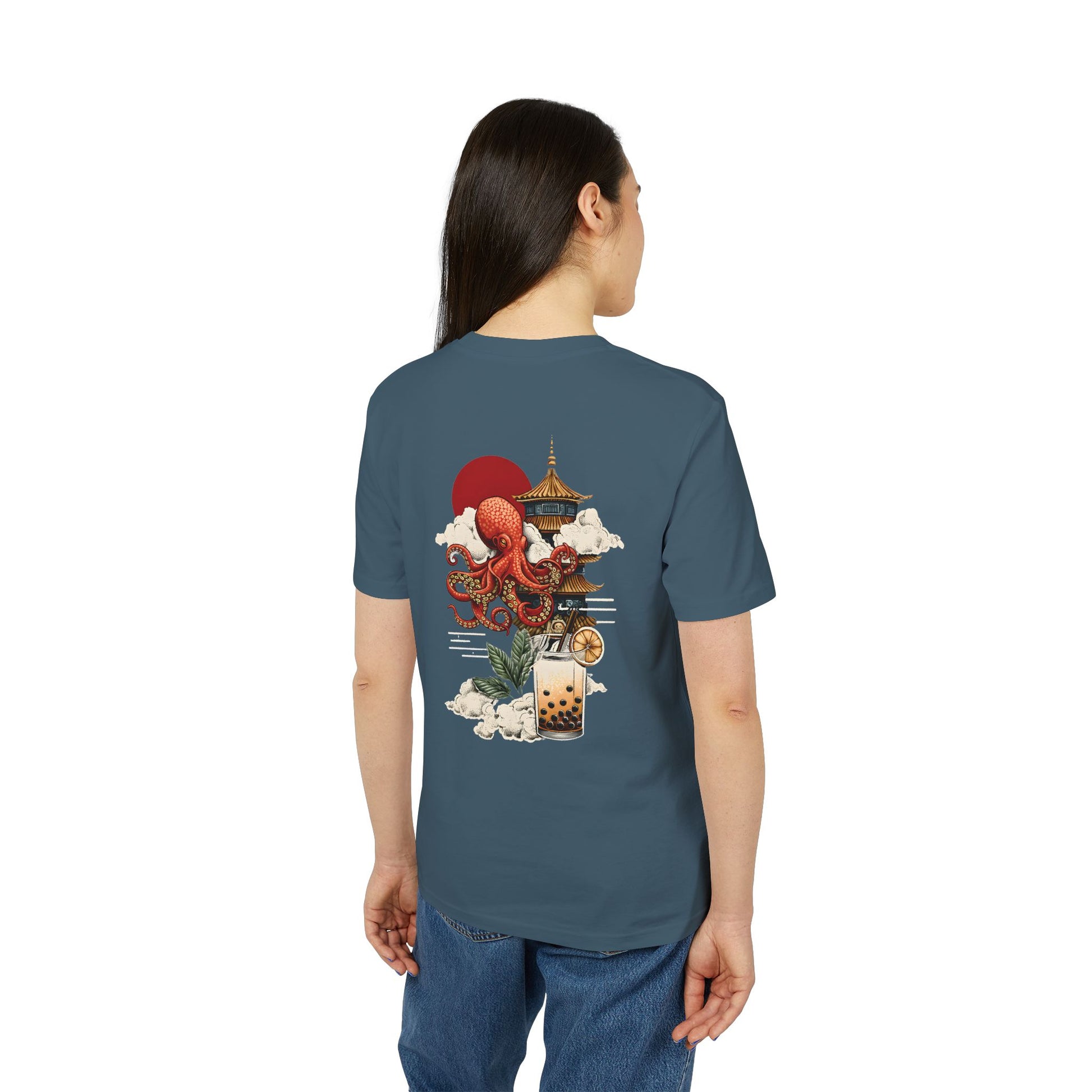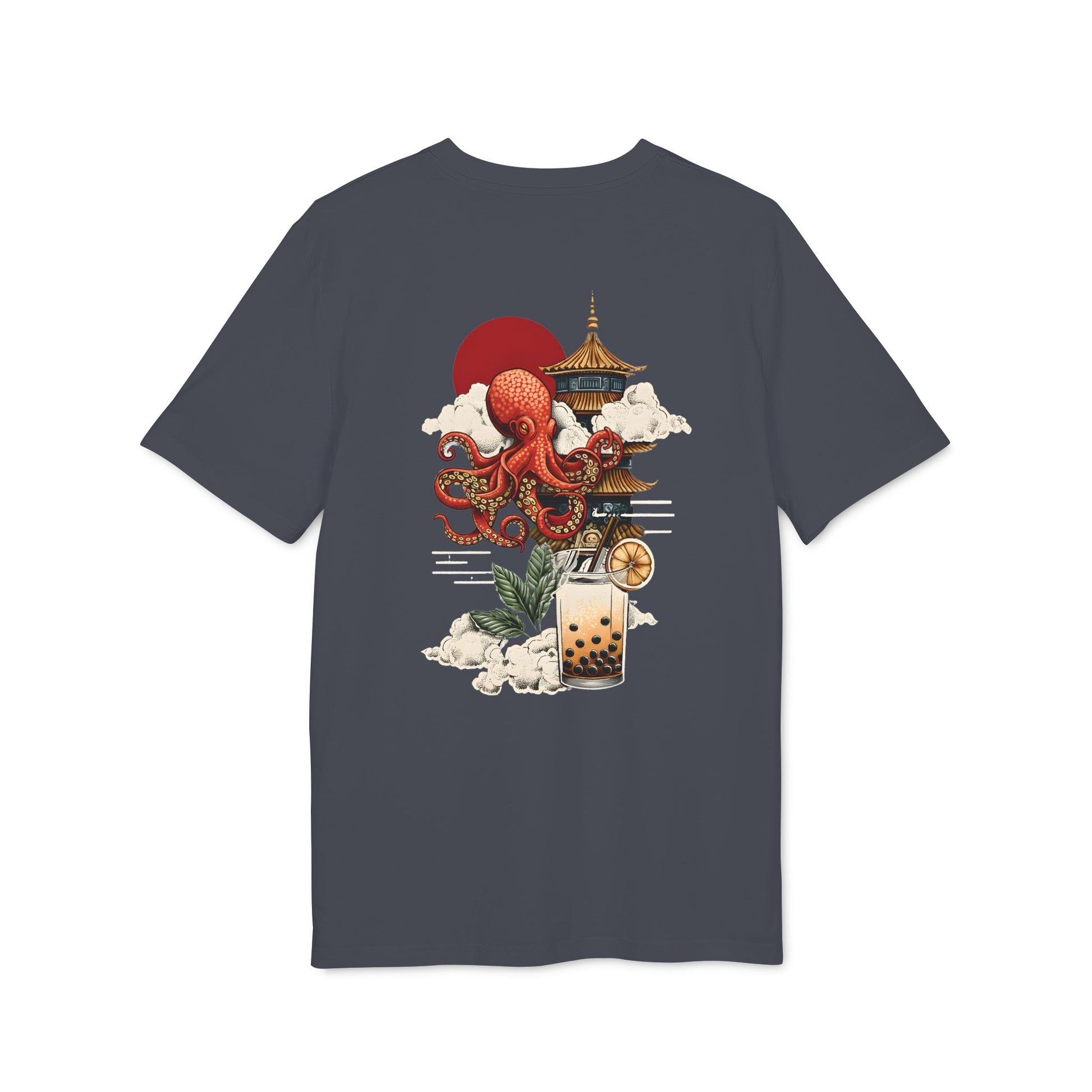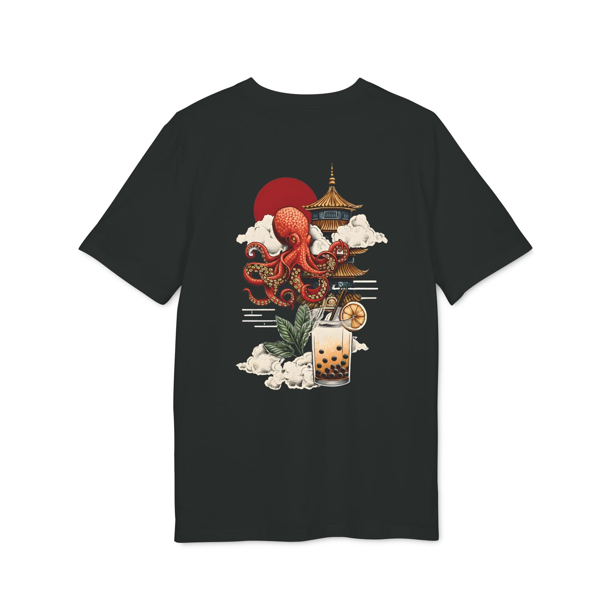 „Octo Bubble Bliss“ vereint japanische Mythologie mit Popkultur – ein majestätischer Riesenkrake erhebt sich über einer Pagode, durchbrochen von Sonne und Wolken. Darunter: Bubble Tea als heiliger Gral.