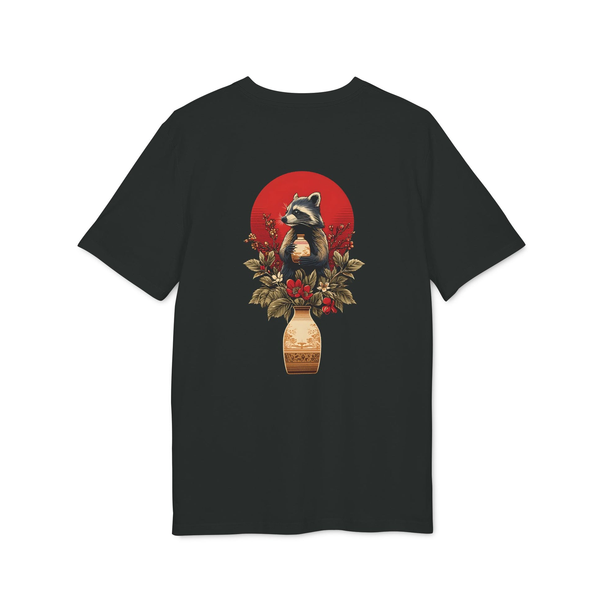 Mit einem heiligen Krug in den Pfoten, unter der roten Sonne, steht der Tanuki zwischen Blüten und Blättern – Sinnbild für Glück, Neugier und freudige Verwandlung.