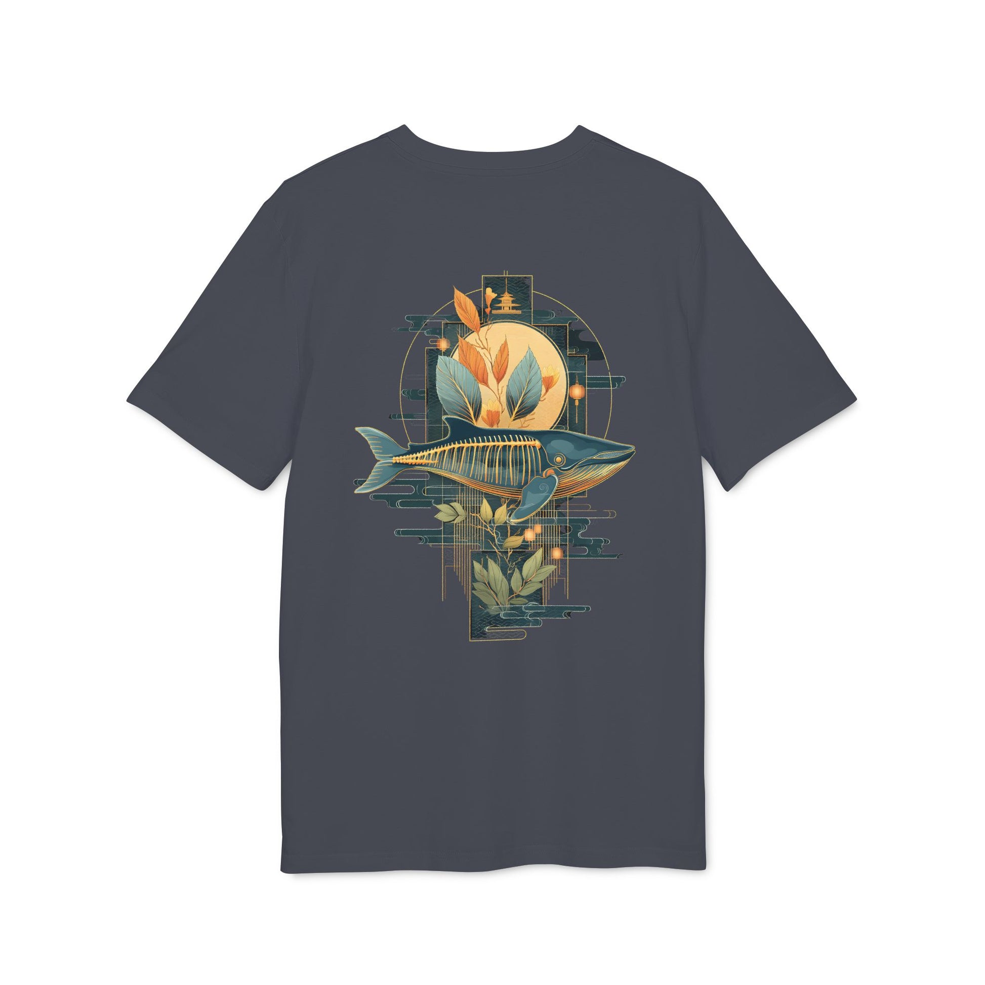 Ein mächtiger Wal gleitet unter einem goldenen Mond, sein Körper verschmilzt mit Blättern und Linien – Sinnbild für Leben, Wandel und unendlichen Fluss.
