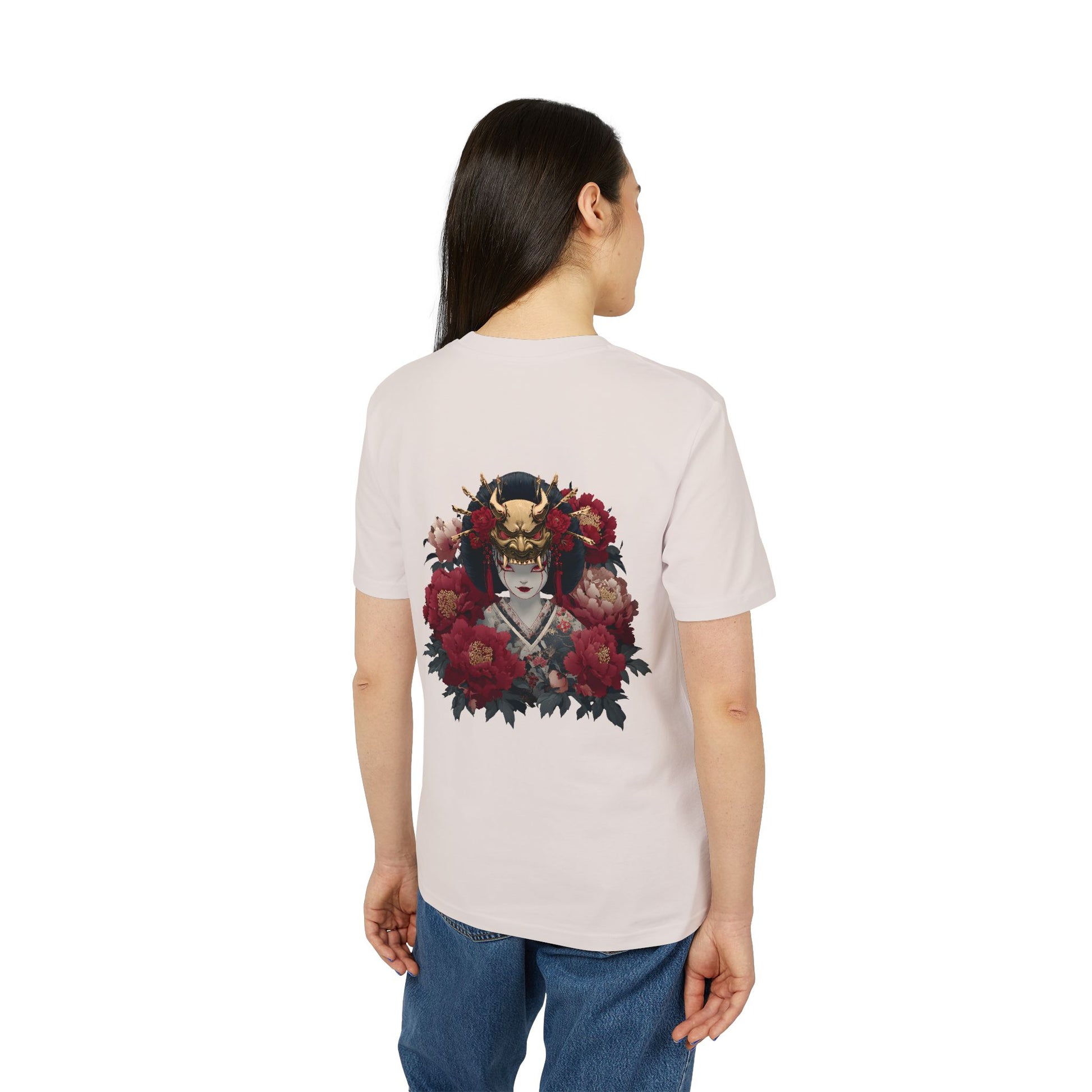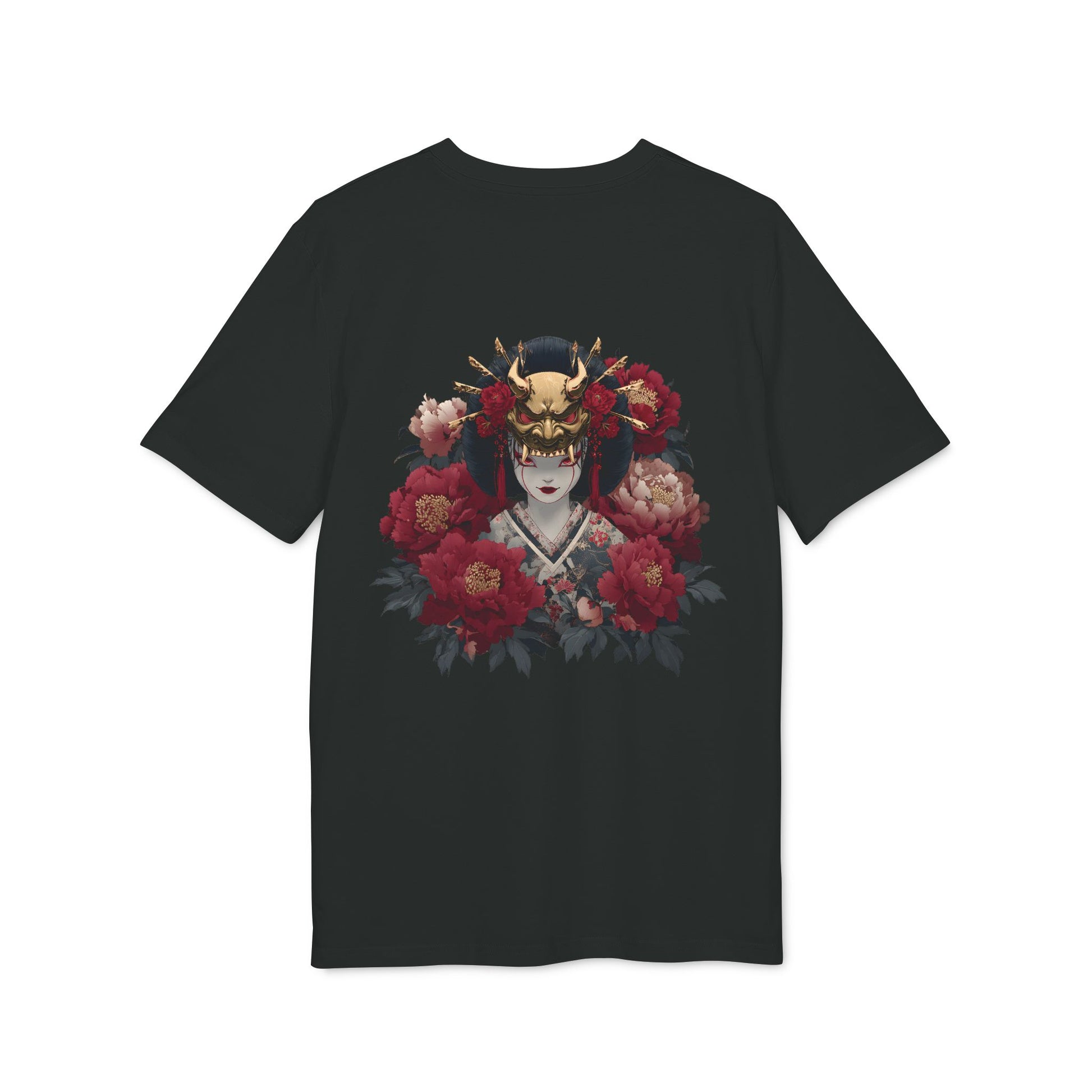 Oni no Hana fuses the grace of the geisha with the wrath of the oni. A golden demon mask hides her emotion, but not her power. Surrounded by lush peonies and dressed in flowing silk, she embodies duality — beauty and danger, tradition and rebellion.