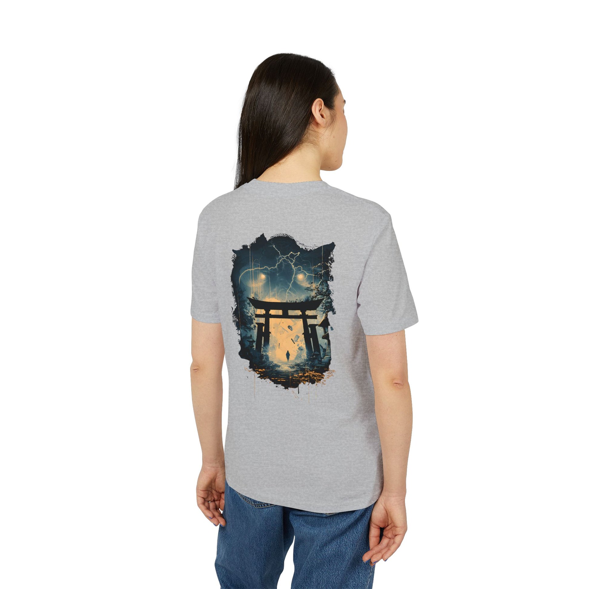 „Raijin no Mon“ zeigt ein vom Sturm durchzucktes Schreintor, durch das eine einsame Gestalt einer gleißenden Verzerrung der Realität entgegengeht. Über ihr kracht der Donner – und im Hintergrund: Augen. Wachsam. Erwartend.