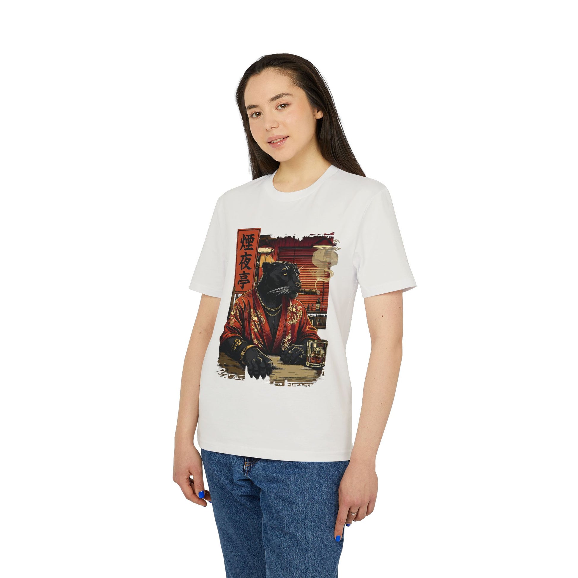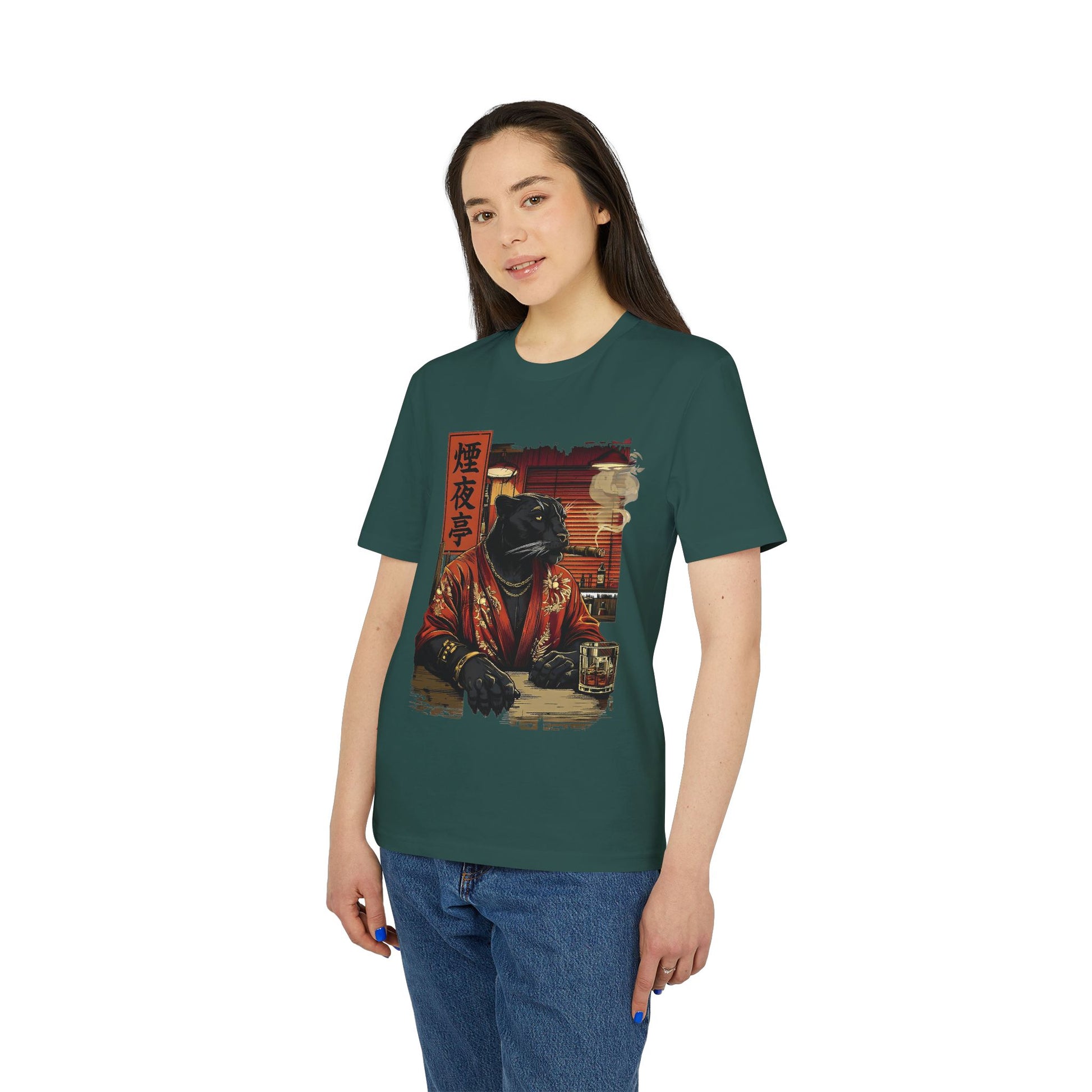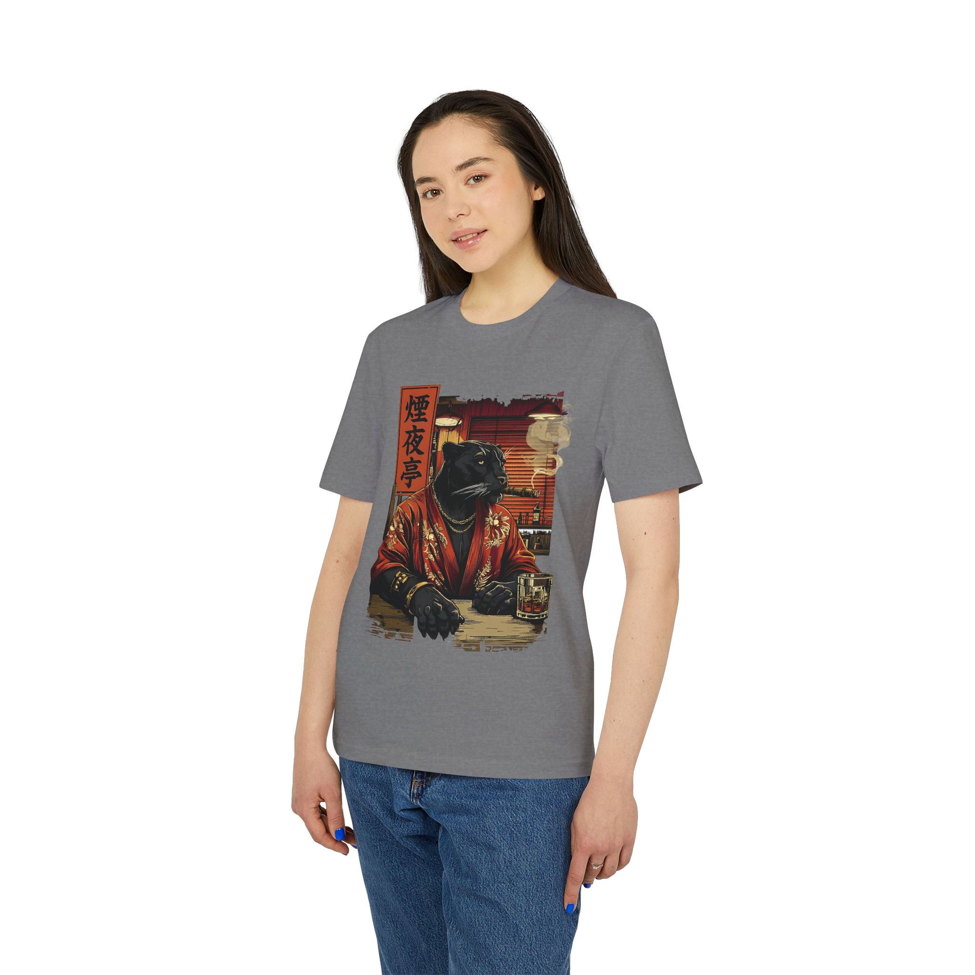 „Kemuri no Yoru“ zeigt einen schwarzen Panther in einem stilvollen Izakaya bei Nacht – im Kimono, mit Zigarre im Maul und Whiskeyglas in der Pranke. Ein Blick genügt: Er kontrolliert den Raum.